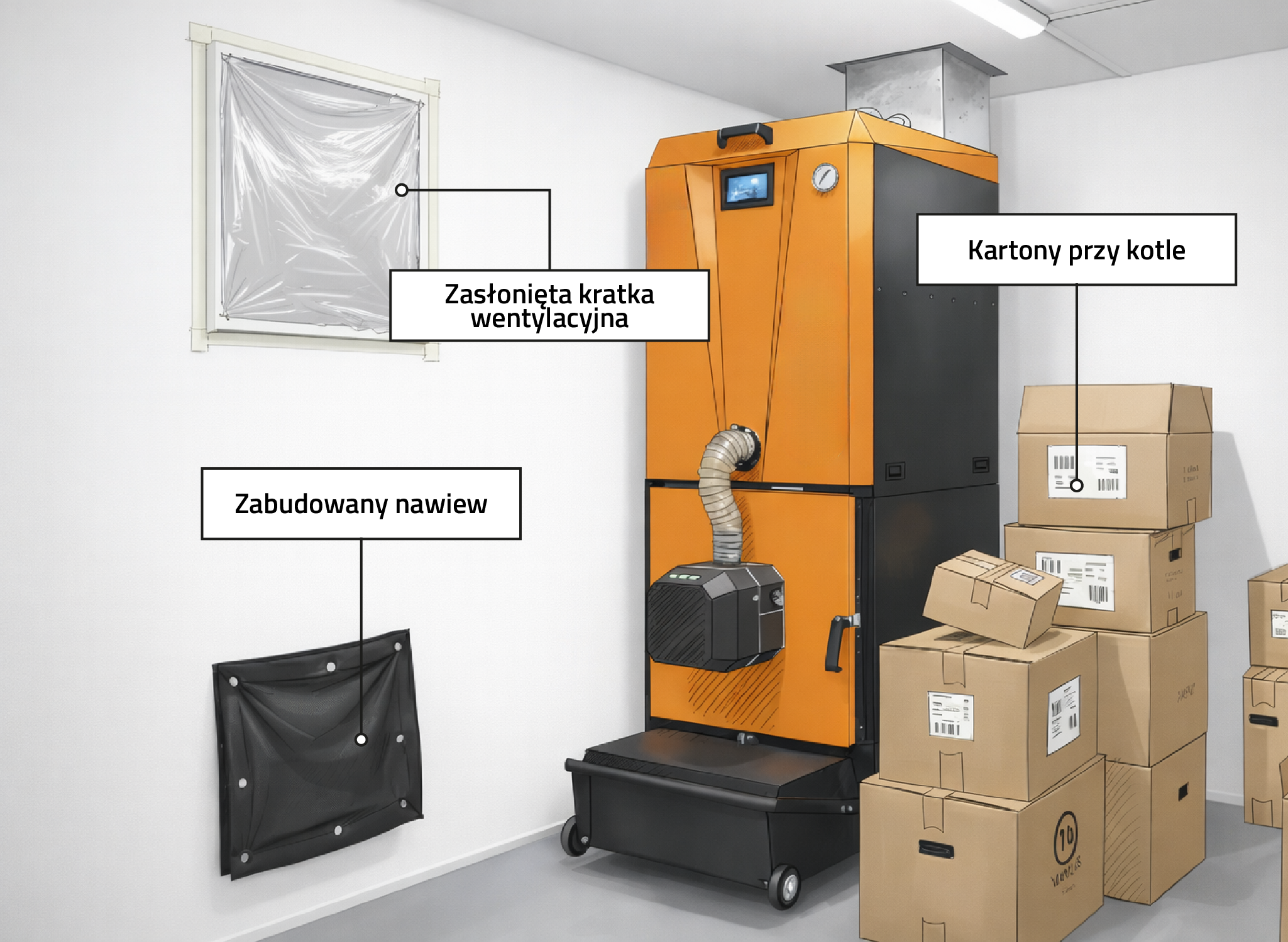 • składowanie dużej ilości rzeczy łatwopalnych, które utrudniają przepływ powietrza i dostęp do kotła,
